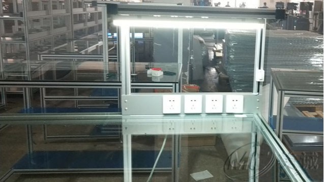 鋼化玻璃操作臺  由專用工業鋁型材作為框架,其需求根據客戶制定進行免費設計、切割加工,配件連接而組成,其中運用了鋼化玻璃作為臺面,裝有照明日光燈,以及電源插座方便實際工作中的操作,提高工作效能。